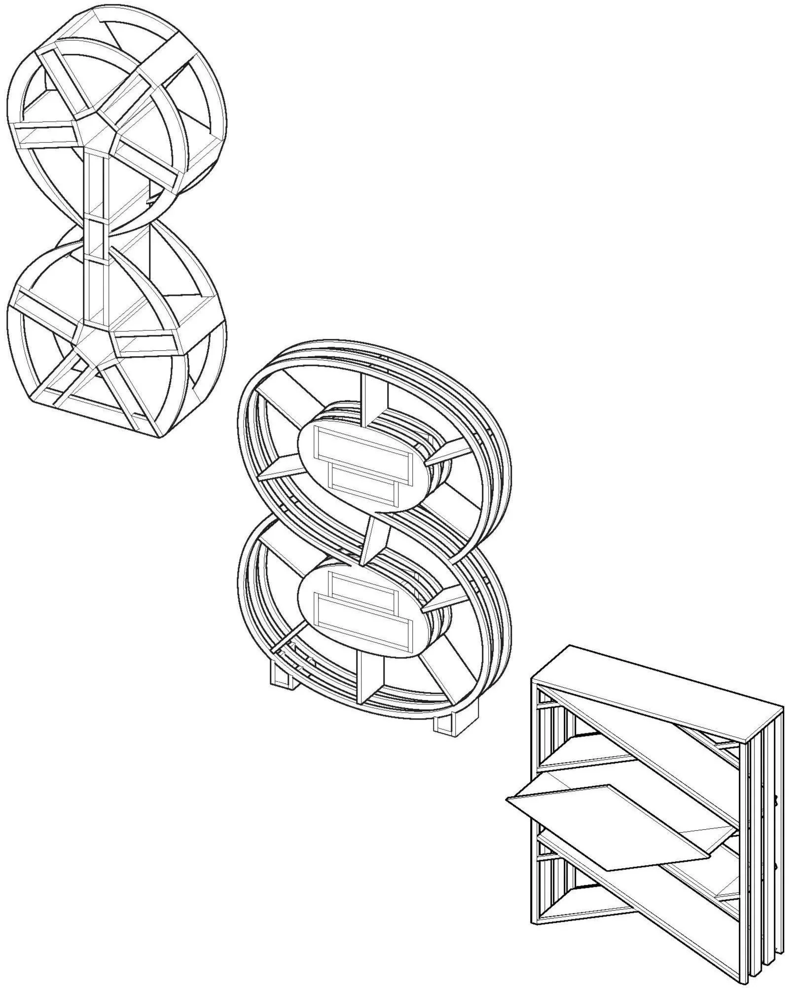 Interwoven diagonal shelves provide 10.5 inches of vertical clearance, accommodating a wide range of standard book sizes. At the center of the piece sit two hinged doors that open to four separate cabinet spaces. The lower compartments are angled and ideal for canned or bottled beverages, while the upper compartments are suited for storing glassware or bar accessories.
